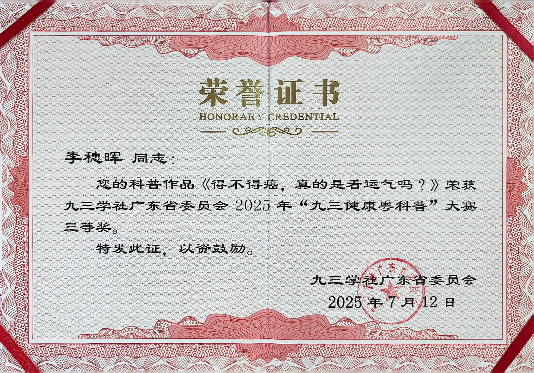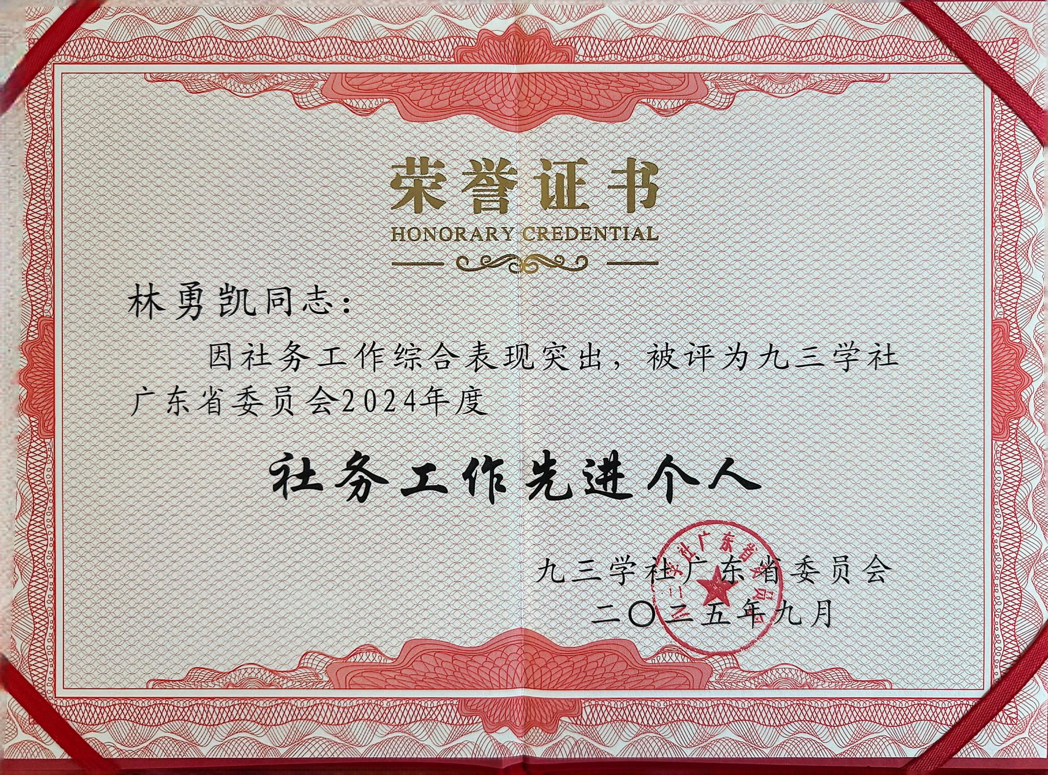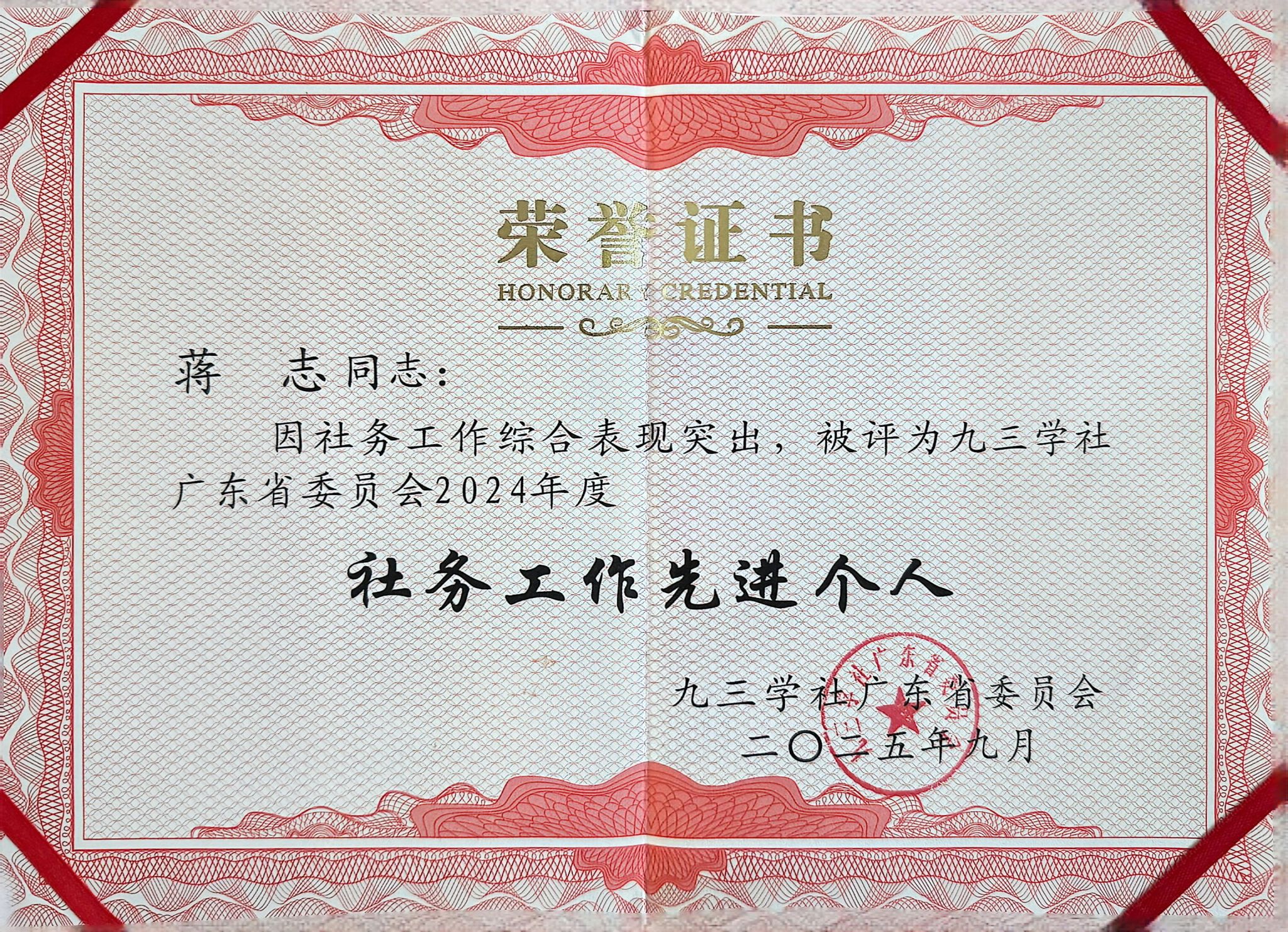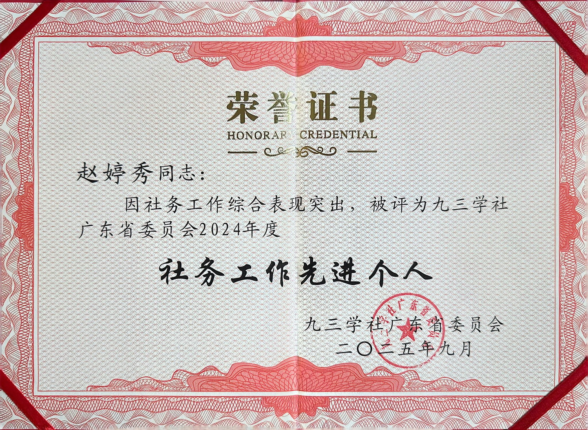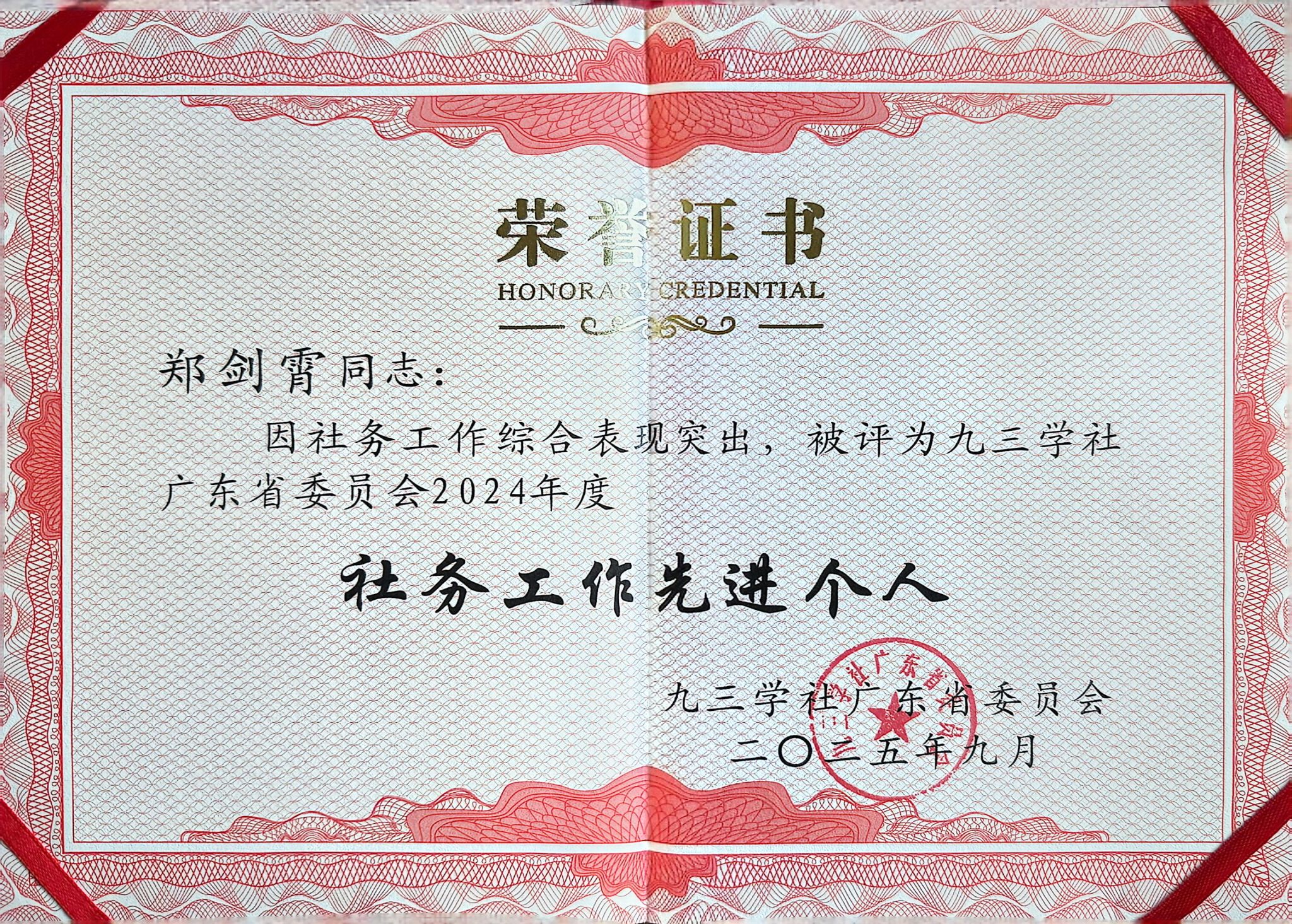 9月1日,九三学社广东省委会召开庆祝九三学社创建80周年大会,九三学社广州中医药大学基层委员会多位社员获得省级表彰。郑剑霄、赵婷秀、林勇凯、蒋志四位社员荣获2024年度“社务工作先进个人”称号,李穗晖社员荣获“九三健康粤科普大赛”三等奖。