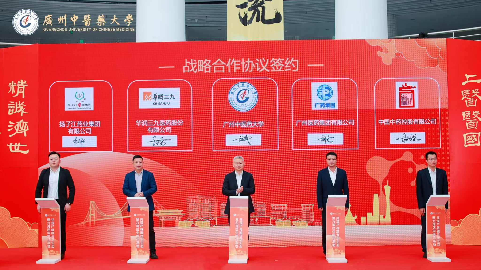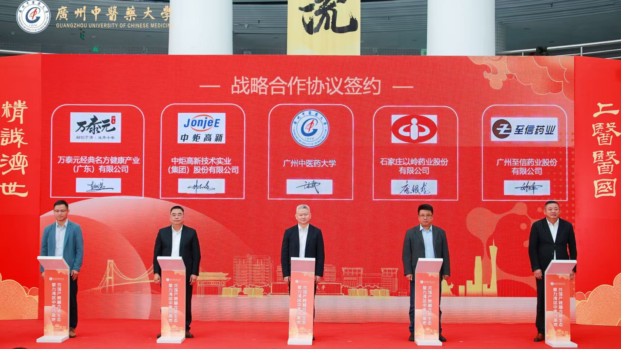 金秋送爽,硕果盈枝。10月25日上午,广州中医药大学在大学城校区国家医学攻关产教融合创新平台一楼大厅隆重举办“聚力湾区中医药高地・共筑产教融合新生态”校企合作签约仪式。广东省教育厅、广东省中医药局相关领导,中药制药、大健康、生物医药、医疗器械等领域知名企业代表,学校领导及师生代表齐聚一堂,共襄中医药产教融合盛举。