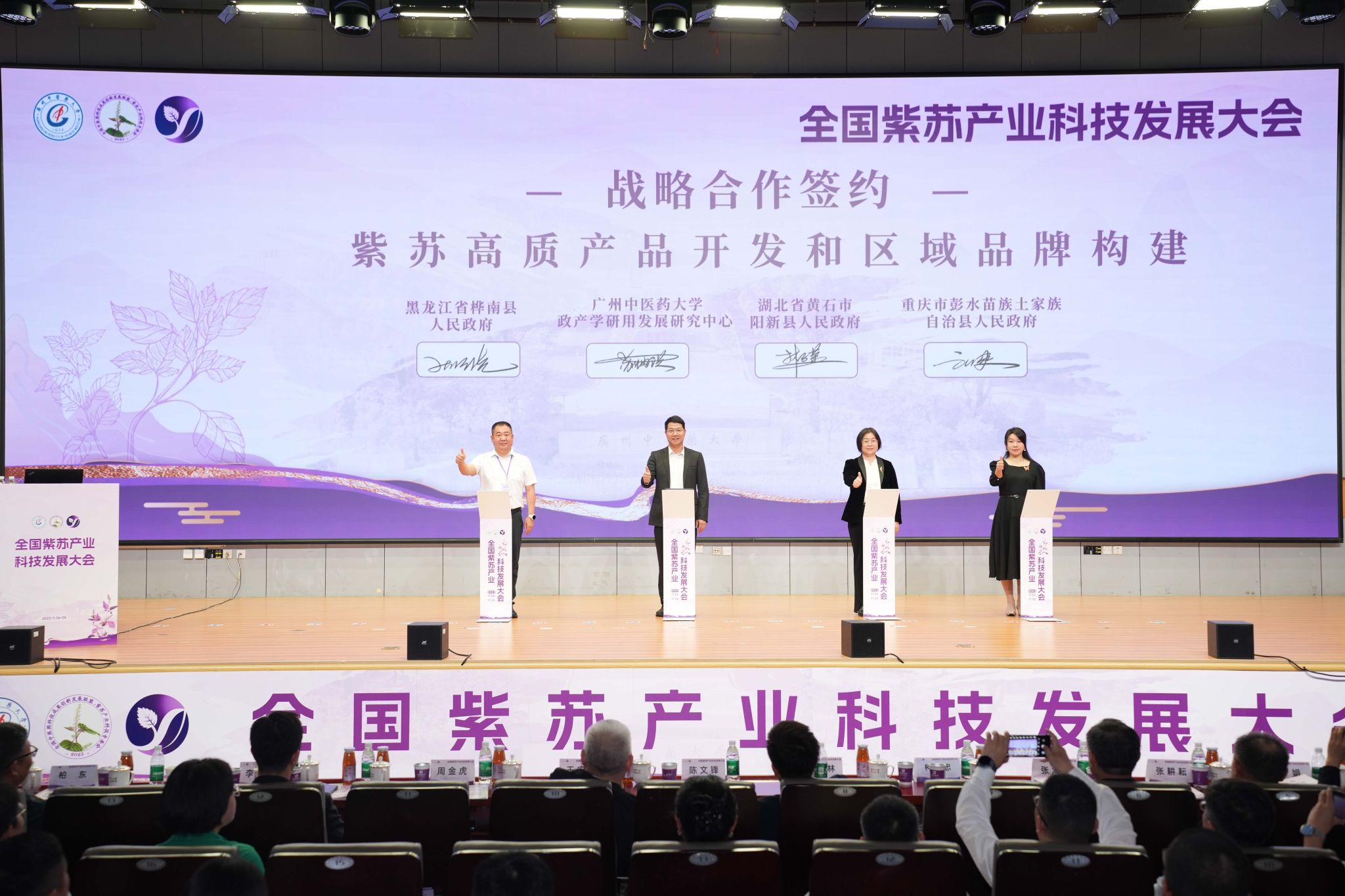 大会现场硕果累累,10项合作签约项目涵盖紫苏高值产品开发、区域公共品牌构建、深加工核心技术合作、科研联合攻关等多个关键领域。广州中医药大学与湖北阳新、黑龙江桦南、重庆彭水等主产区政府达成校地战略合作,多家龙头企业与科研机构开展紫苏功效物质高效提取、国际化产品培育等联合攻关,标志着以紫苏产业为纽带,以教育链为基础、人才链为核心、创新链为动力、产业链为载体的“四链”融合体系初显实效,共同筑造高质量发展新生态。