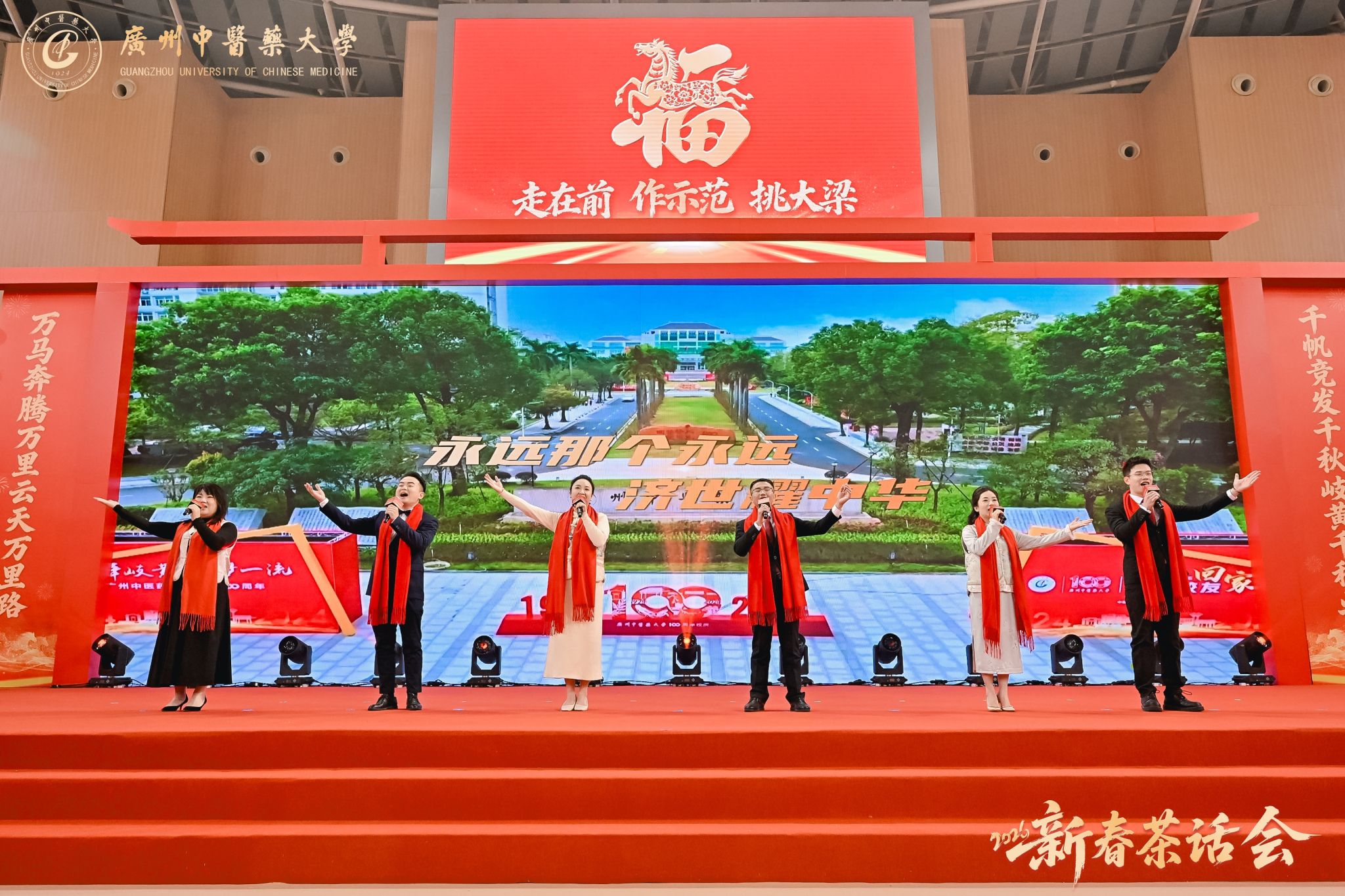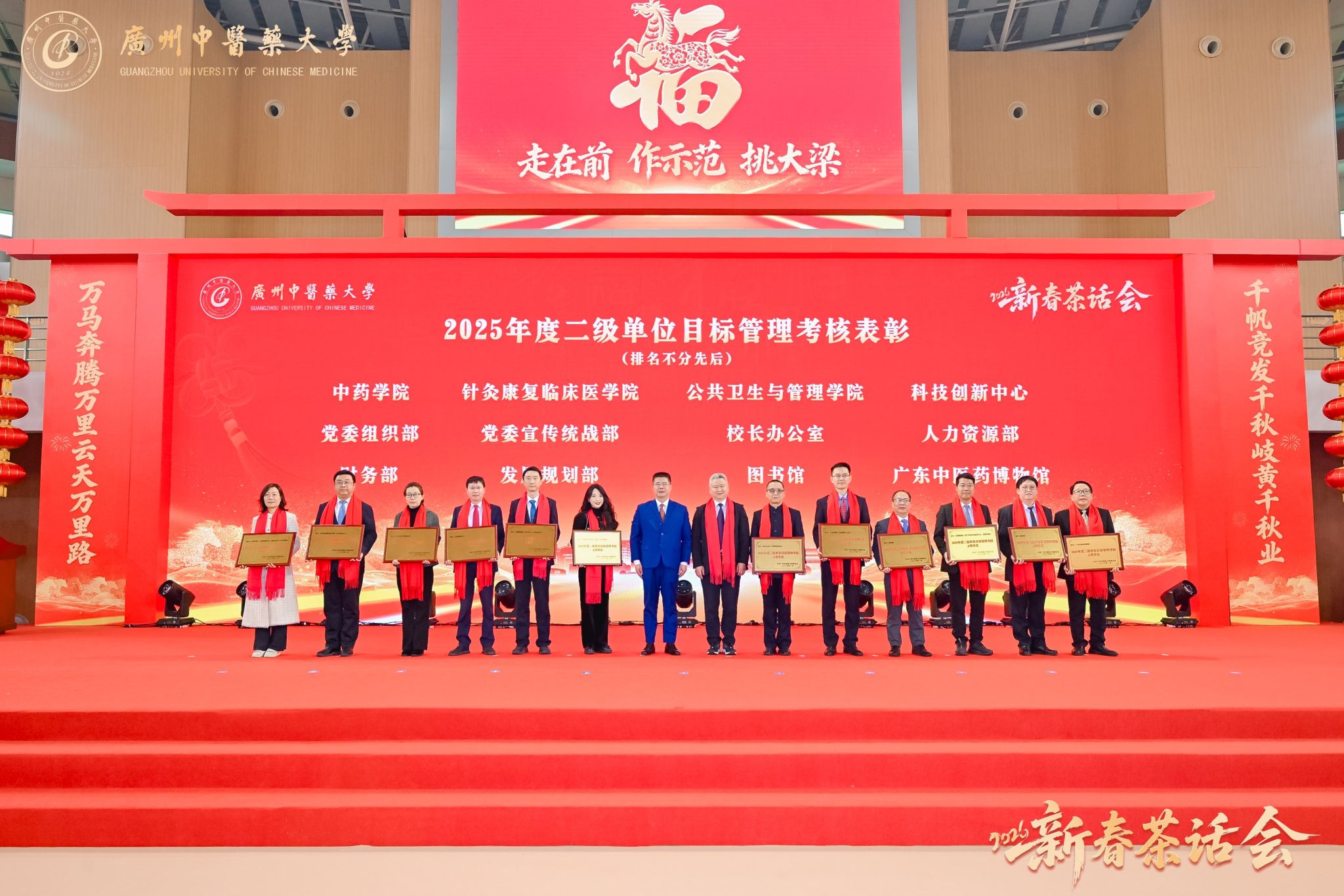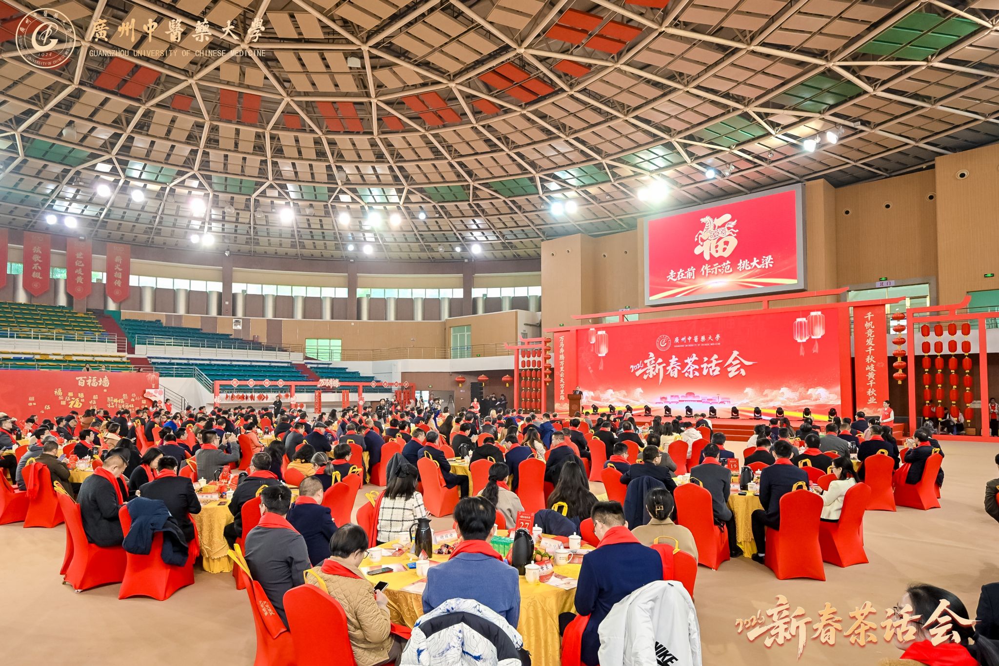 万马奔腾启新程,千秋岐黄续华章。2026年1月23日,广州中医药大学2026年新春茶话会在大学城校区体育馆举行。学校党委书记陈文锋、校长王宏斌等学校领导班子成员,和师生代表欢聚一堂,喜迎新春佳节。茶话会由学校副校长刘中秋主持。