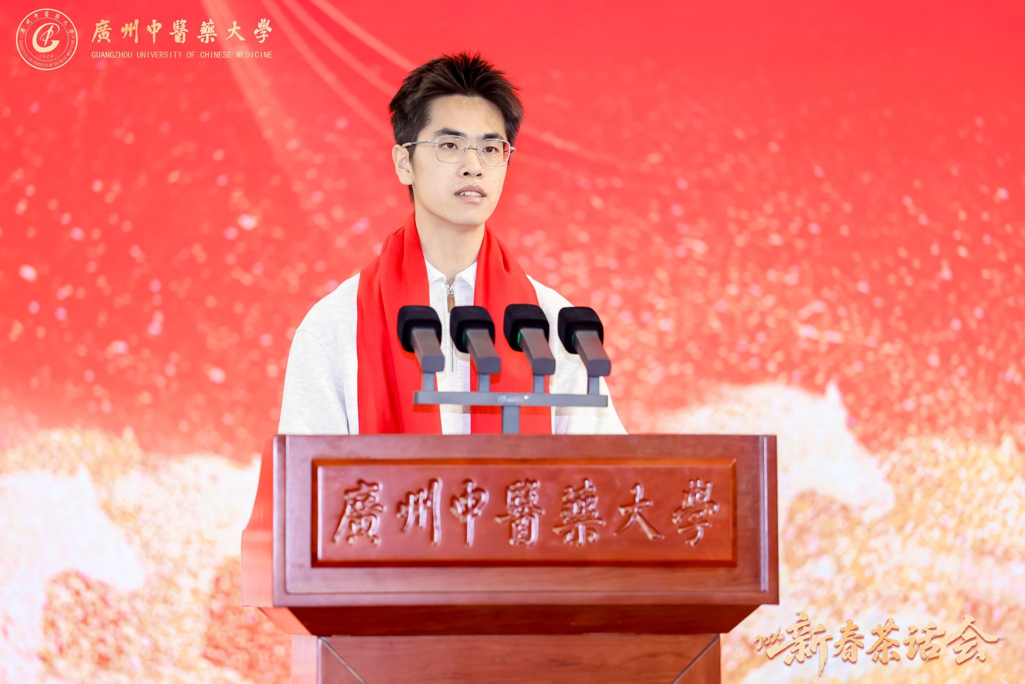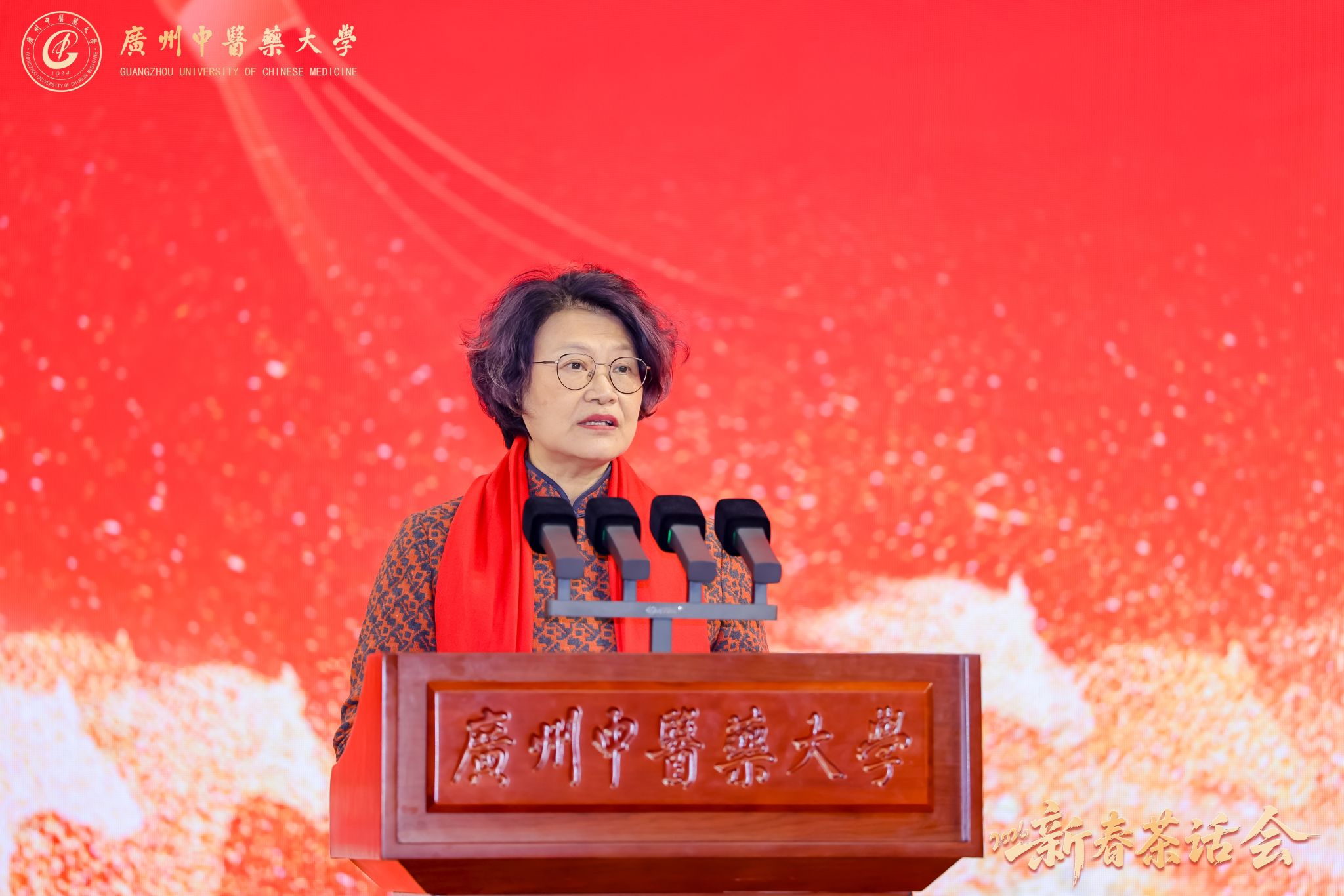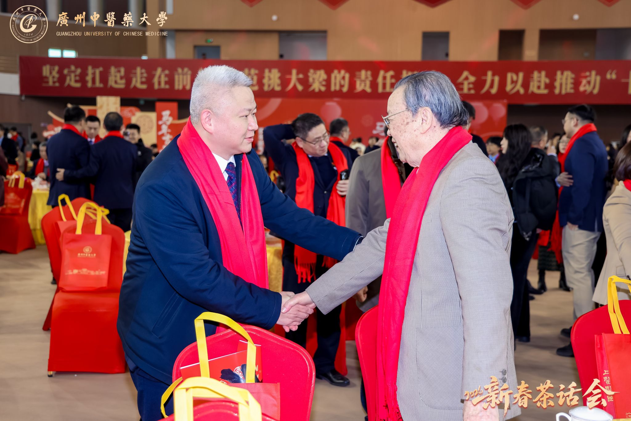 万马奔腾启新程,千秋岐黄续华章。2026年1月23日,广州中医药大学2026年新春茶话会在大学城校区体育馆举行。学校党委书记陈文锋、校长王宏斌等学校领导班子成员,和师生代表欢聚一堂,喜迎新春佳节。茶话会由学校副校长刘中秋主持。