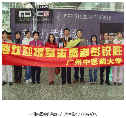 2008年1月21日,广州中医药大学第一临床医学院2005级中医内科学硕士研究生彭锐从塞舌尔载誉归来。作为中非合作论坛后我国第一批援塞自愿者之一,彭锐于1月24日在北京人民大会堂接受了团中央书记处书记卢雍政、商务部副部长魏建国以及塞舌尔驻华大使的亲切接见,并被授予中国青年志愿服务铜奖,为广州中医药大学研究生赢得了荣誉。