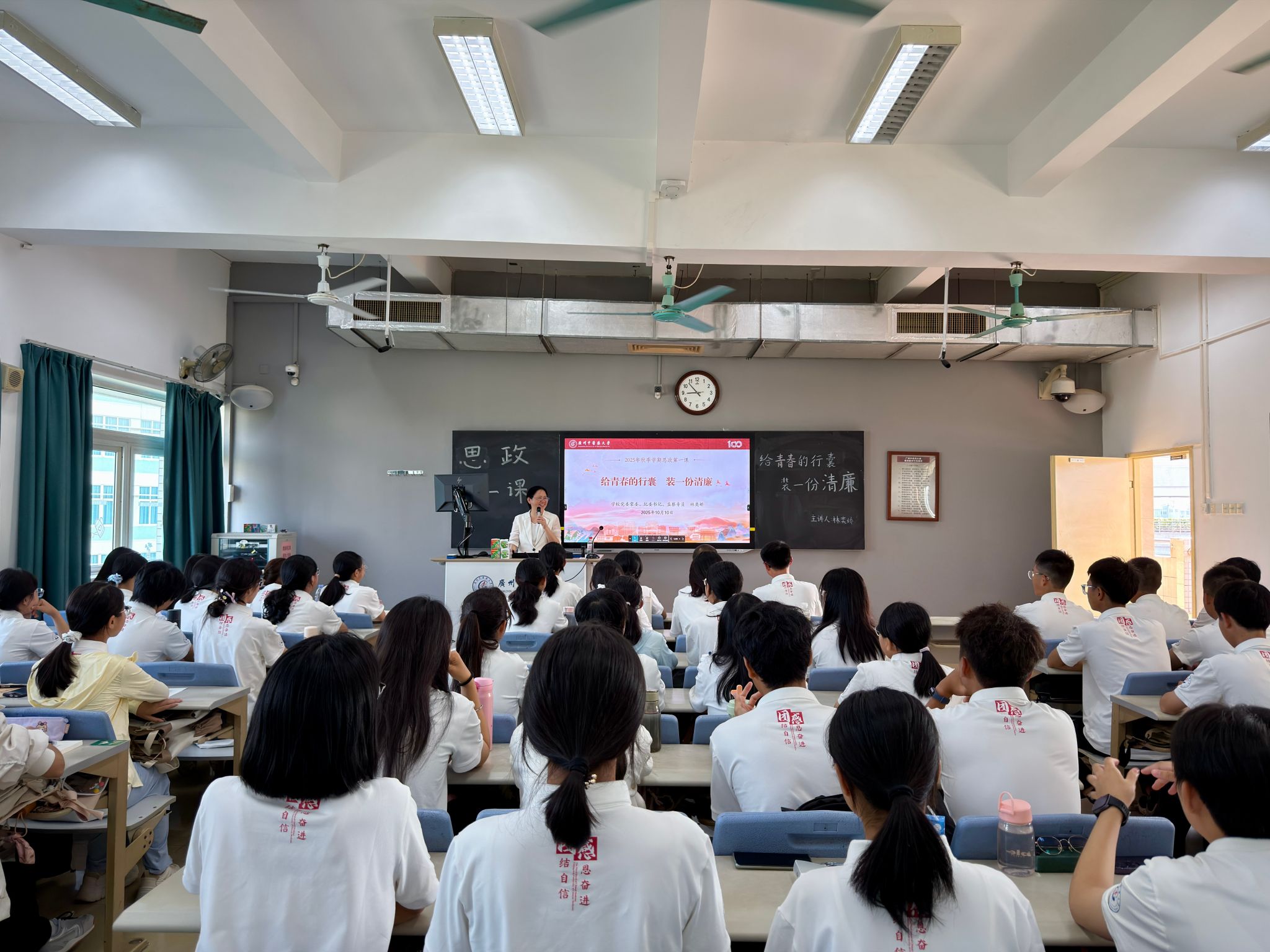 随后,林奕娇结合即将到来的第十五届全国运动会,用羽毛球、百米赛跑等体育项目阐述比赛中蕴含的廉洁哲理,通过发生在校园的真实案例提醒同学们要筑牢防线,语重心长地教导同学们:廉洁是行稳致远的根本,只有守住廉洁的底线,才能在人生的道路上走得踏实、走得长远。