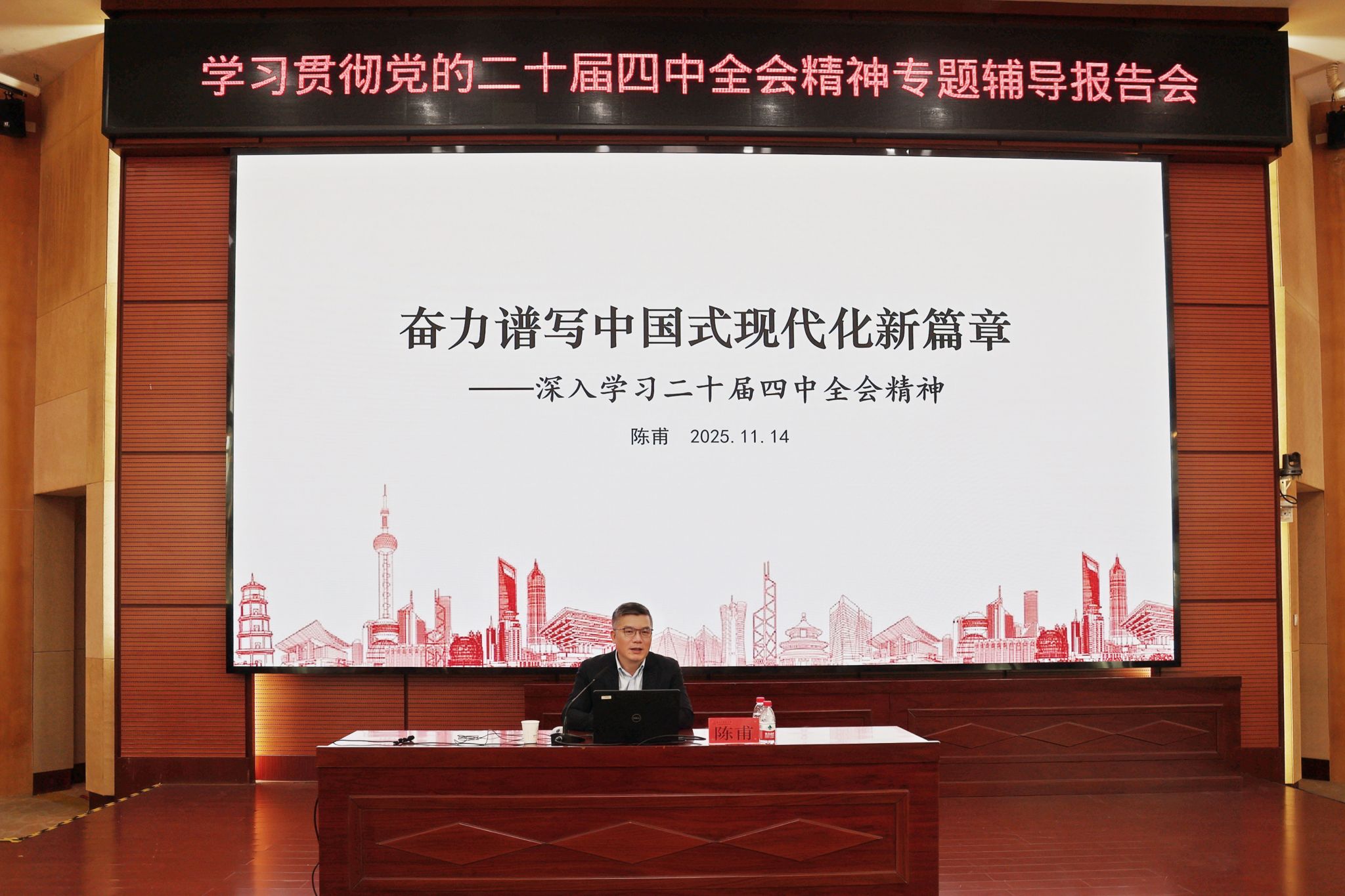 陈甫以《奋力谱写中国式现代化新篇章——深入学习党的二十届四中全会精神》为题,围绕党的二十届四中全会精神和“十五五”规划建议,结合当前国内外形势,从“十四五”发展成就、“十五五”战略部署与香港角色机遇三个维度作了专题辅导报告。报告系统阐释了我国经济实力跃升、科技创新突破、绿色转型领跑等极不平凡的发展成就,深刻解读了2026—2030年承前启后的关键期中,以推动高质量发展为主题、以实体经济为本、以科技自立自强为战略支撑、构建新发展格局等核心要义,并深入分析了香港在巩固国际金融中心地位、融入国家创新体系、发挥“制度转换器”独特优势中服务强国建设的时代使命。整场报告政治站位高、视野宏阔、分析透彻,对全校师生准确把握全会精神实质,坚定推进中国式现代化信心具有重要的指导意义。