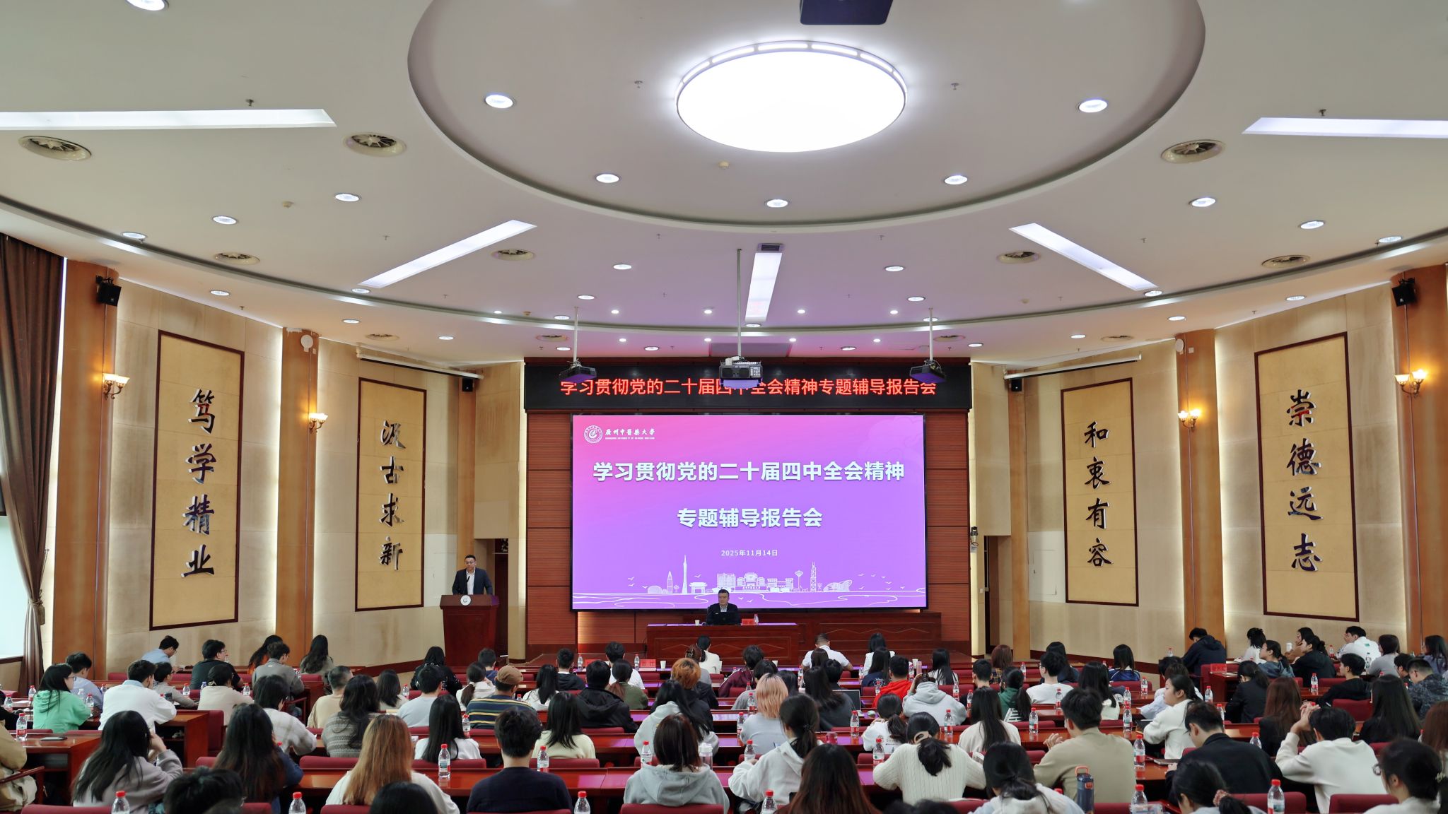 11月14日上午,广州中医药大学在大学城校区举行学习贯彻党的二十届四中全会精神专题辅导报告会。广东省社会科学院研究员陈甫应邀作专题辅导报告。中央政府驻港联络办广东联络部二级巡视员、人事处处长何彬出席报告会。报告会由港澳台和外事工作部副部长(主持工作)陆冠儒主持。