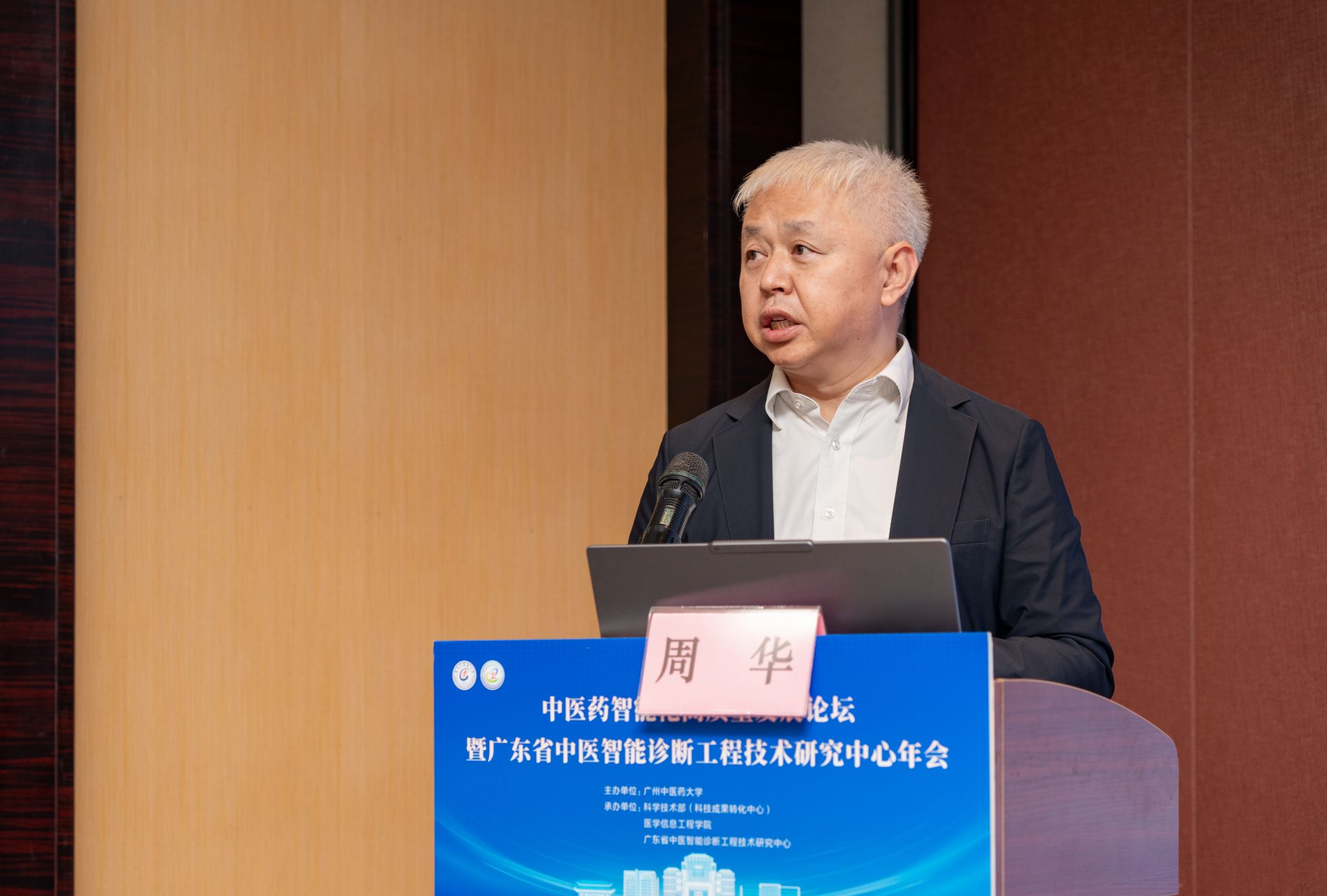 主旨报告环节,邀请南京中医药大学副校长胡孔法、中医药广东省实验室副主任周华分别作专题报告。胡孔法聚焦中医药大数据融合应用,阐述了数据采集标准、存储架构及分析模型构建思路,分享了团队在临床数据挖掘、药物研发数据整合的实践成果,提出大数据驱动中医药智能化发展的创新路径。周华以“人工智能和自动化技术赋能中药研发——设计与实践”为主题,重点分析了两种技术融合赋能中药研发的重要价值,为相关技术的产业化应用提供新思路。