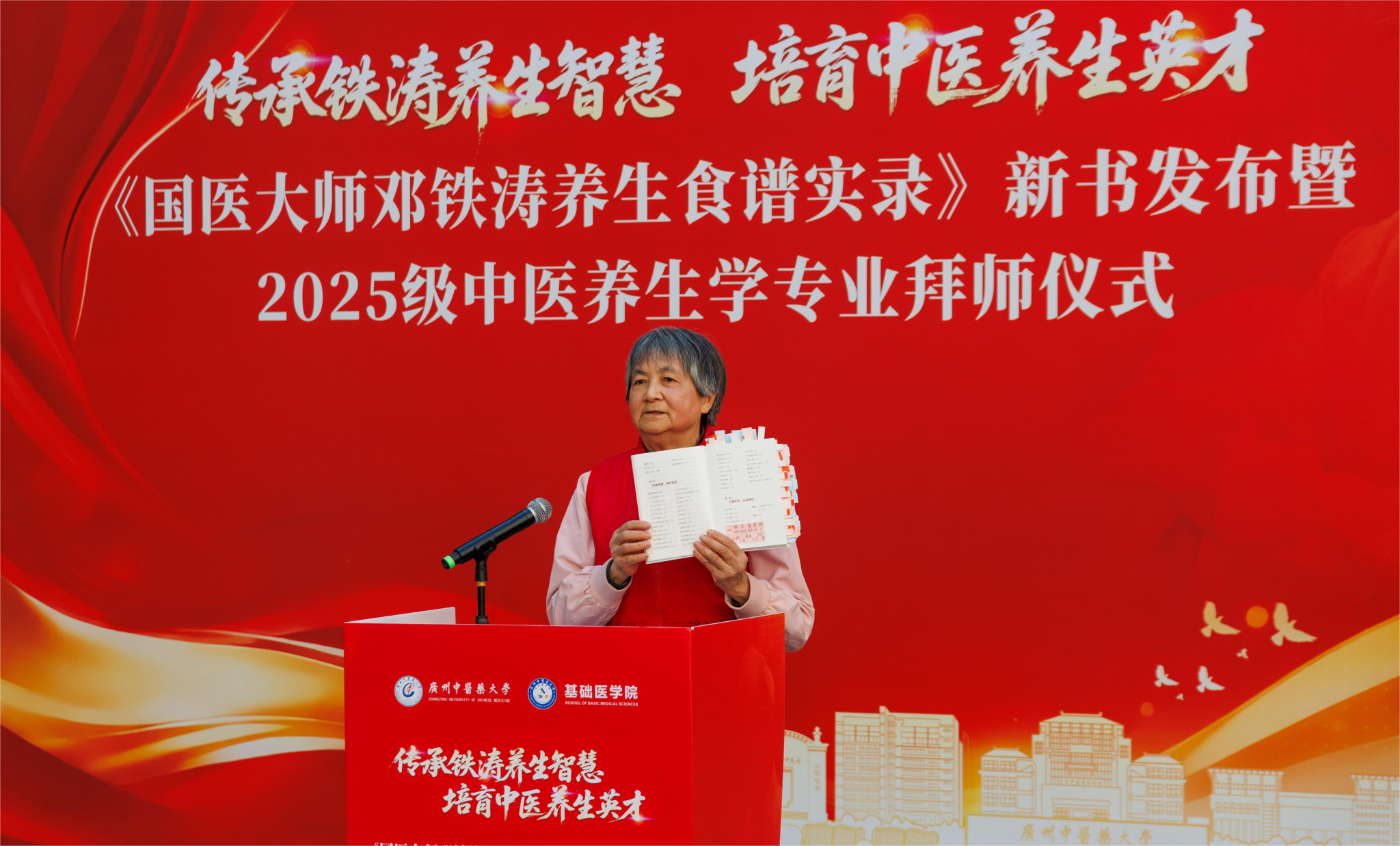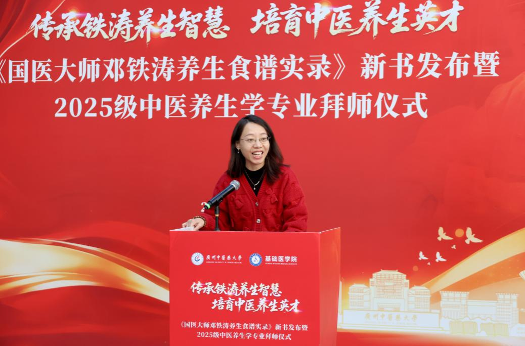2026年1月11日下午,《国医大师邓铁涛养生食谱实录》新书发布暨2025级中医养生学专业拜师仪式在基础医学院邓老广场举行。活动以“传承铁涛养生智慧,培育中医养生英才”为主题,学校领导、邓老亲属及弟子代表、师生代表和社会各界同仁齐聚一堂,共同见证这一兼具学术深度、人文温度与时代高度的中医药传承盛事。活动由基础医学院党委书记单丽囡主持。