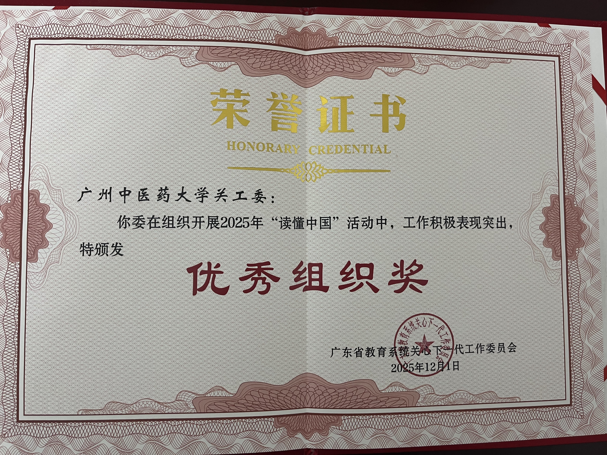 近日,教育部关心下一代工作委员会公布2025年“读懂中国”活动评选结果,广州中医药大学关工委获评2025年“读懂中国”活动表扬单位,并有1篇征文获评教育部关工委“优秀征文”。